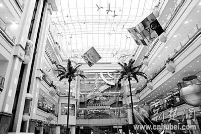 面積大,是武漢銷品茂給人的第一感覺。寬闊的通道,3個(gè)綿延的中庭,密集的店鋪一眼望不到邊。一個(gè)忙著擺花草的工人說,面積太大了,他前前后后來了七八次,仍稍不注意就會(huì)迷路。頗為有趣的是,東路、南街、天橋、內(nèi)環(huán)等城市常用的路標(biāo)名詞,在銷品茂內(nèi)隨處可見。而店方給出的相關(guān)數(shù)字,更讓人感受到這個(gè)商海航母的龐大:1家大型百貨店;1家超市大賣場(chǎng);3個(gè)大型中庭;4條風(fēng)情摩爾街;6個(gè)主題樓面;20多家主題餐廳、咖啡廳;69部電梯;2000個(gè)停車位;20萬平方米的建筑面積……