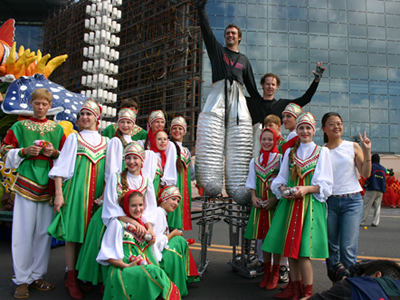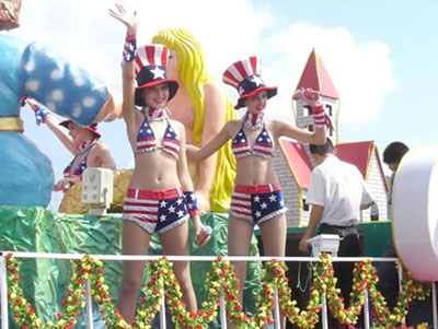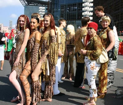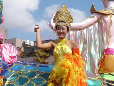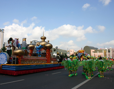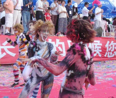今天上午在新海廣場舉行的第六屆大連狂歡節(jié),更是使歡樂的海洋里掀起了歡樂的海潮。來自國內(nèi)外的24支狂歡巡游隊伍,以花團(tuán)錦簇的民族服裝和極度夸張的藝術(shù)手法,演繹了航天、花神、特洛伊木馬、梁山伯與祝英臺、孔雀仙子、海底動物、蝴蝶服飾、阿凡提、醉酒、美人魚、回娘家、貓友、豪華游覽馬車、日月潭傳說、堂吉訶德、木偶奇遇、狐假虎威、寶蓮燈、海娃與王子、小櫻丸子、尼爾斯騎鵝記、阿里巴巴、輪滑表演等國內(nèi)外著名童話,電影故事等。最為耀眼的是以音樂劇《貓》的扮相出場的表演隊伍,他們獨特的表演和造型贏得了在場觀眾最多的歡呼聲?駳g的服裝藝術(shù)巡游,吸引了數(shù)萬國內(nèi)外游客和當(dāng)?shù)孛癖姷挠^賞。