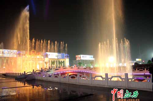 百米長(zhǎng)的音樂噴泉伴隨著《中國人民解放軍進(jìn)行曲》、《走進(jìn)新時(shí)代》等雄壯的樂曲翩翩起舞