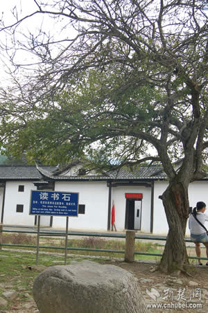 舊居坐落在大井村中央,因墻壁為白色,慣稱它為"白屋"。這棟房子共有44間,五個天井,面積近千平方米。毛澤東率領工農(nóng)紅軍首次到達大井時就住在這里,此后便成為毛澤東在大井的住地。1929年1月底,這棟房子被敵人燒毀,僅剩下一堵殘墻、屋后的兩棵樹和房前草坪上的一塊大石頭。1960年,當?shù)卣丛残迯,將殘墻嵌入新墻之中作為紀念。屋前的有塊大石頭因毛澤東時常坐在上面看書讀報、批閱文件,被人稱為“讀書石”。