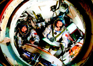 神六即將發(fā)射,宇航員正在進行緊張訓練。