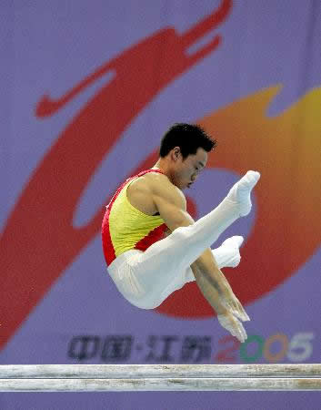 10月13日,湖北選手楊威在自由體操比賽中。當晚,十運會體操男子全能決賽在南京奧體中心舉行。楊威最終奪得銀牌。(新華網(wǎng))