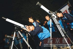 13日凌晨6時(shí),平谷一中學(xué)的天文愛好者使用天文望遠(yuǎn)鏡等待神六出現(xiàn)。