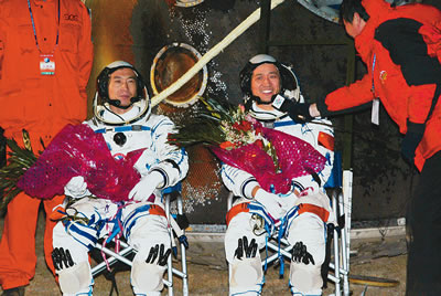 After a snack of noodles, tea and chocolate, Fei and Nie set off by helicopter for a local airport. Later they were to fly from there to Beijing where a grand ceremony will be held.