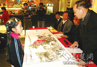 “劉老師,看看我的畫吧!”9歲的張俁俁是武昌中華路小學(xué)學(xué)生,她第一個(gè)交出自己的牡丹長卷請(qǐng)老師“檢閱”。陪同前來的母親吳女士在一旁介紹:“俁俁看到報(bào)紙后就一直惦念這事。今天一早她就起床了,拉著我跟她外婆往這趕!