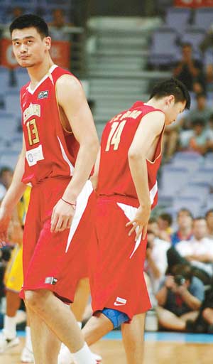 第二節(jié)還有9分13秒時,姚明上場,明郅組合終于出現(xiàn)。姚明打內(nèi)線,王治郅打外線,兩人難有很好配合。巴西隊以44比38結束上半場。