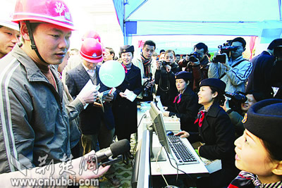 像譚梅一樣,昨天共有300多名農(nóng)民工涌到武漢市總工會(huì)大院,參加了在這里舉行的武漢市農(nóng)民工“平安返鄉(xiāng)”票務(wù)趕集會(huì)。在武漢市總工會(huì)組織下,漢口火車(chē)站、傅家坡長(zhǎng)途汽車(chē)站、武漢港務(wù)集團(tuán)客運(yùn)站等7家客運(yùn)單位,紛紛來(lái)到趕集會(huì)現(xiàn)場(chǎng),為農(nóng)民工提供熱情的票務(wù)服務(wù)。