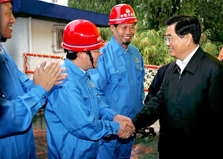 8時(shí)48分,胡錦濤一行乘車來到天興洲大橋建設(shè)工地,鐵道部黨組書記、部長劉志軍代表工程建設(shè)者熱烈歡迎總書記來建設(shè)工地考察。他說,今天,是中國鐵路人最難忘的日子。在我們興建世界一流的公鐵兩用橋的時(shí)候,總書記來到建設(shè)工地,這是對中國鐵路人的極大關(guān)懷。我代表220萬鐵路員工,也代表參加大橋建設(shè)的全體工程技術(shù)人員和職工,向總書記表示,一定通過這次總書記考察,把中國鐵路的工作做得更好,把中國鐵路的建設(shè)搞得更好,把天興洲大橋建設(shè)成世界一流的現(xiàn)代化大橋。