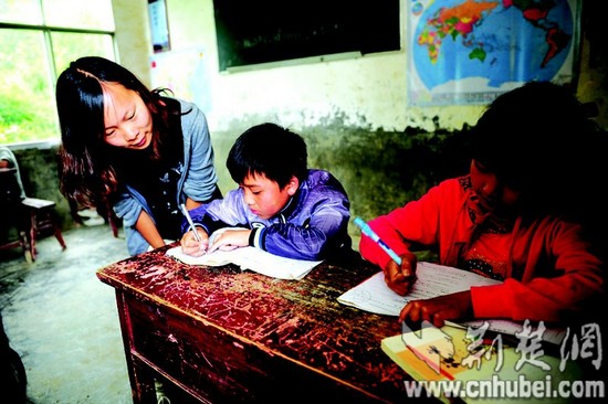圖為:張春麗再次走進課堂,輔導(dǎo)孩子們語文。